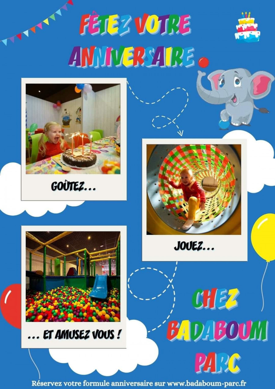 Fetez votre anniversaire ! Pensez à réserver l'anniversaire de votre enfant à BADABOUM PARC DE SAUMUR DISTRE Votre table préparée dans un box privatif de 14h à 18h et accès à tous les jeux à volonté Réservez dès maintenant sur www.badaboum-parc.fr ou au 02.41.40.80.58