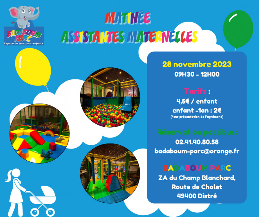 MATINÉE ASSISTANTES MATERNELLES mardi 28 NOVEMBRE MATINÉE ASSISTANTES MATERNELLES mardi 28 NOVEMBRE de 9h30 à 12h à BADABOUM PARC de DISTRÉ SAUMUR Réservation n'est pas obligatoire